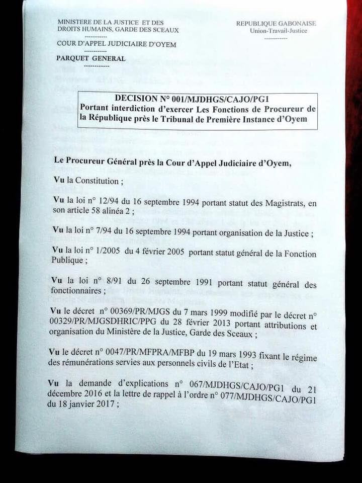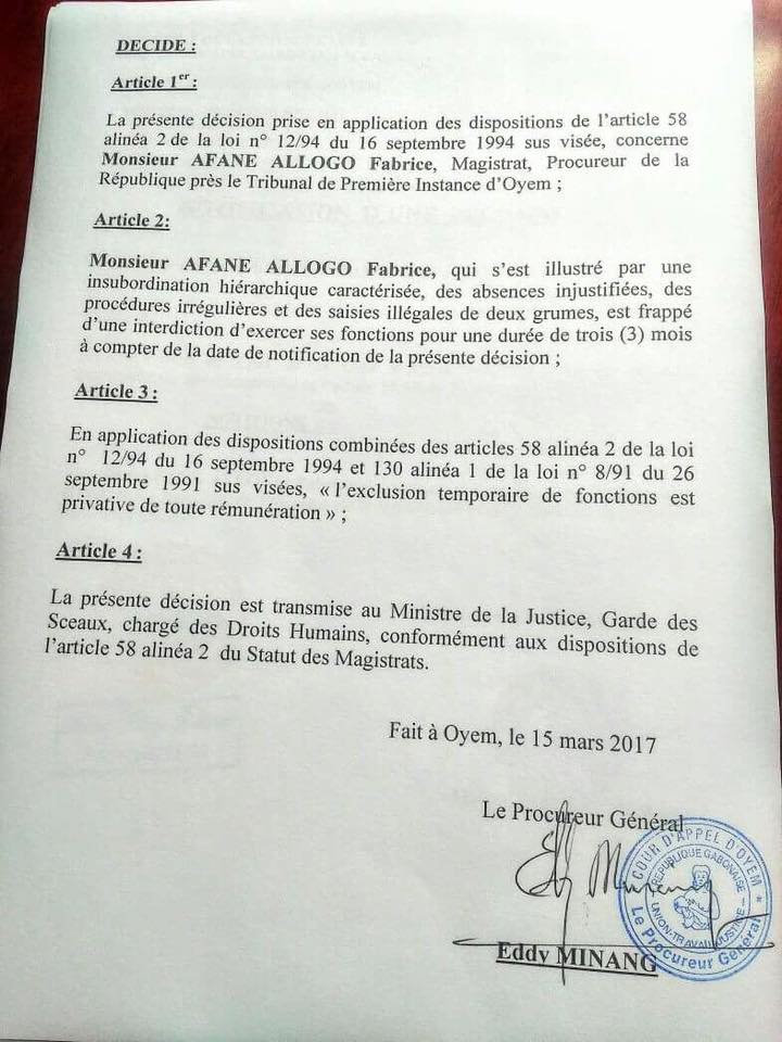 Le tribunal de Première instance d’Oyem (Woleu-Ntem) n’a plus de procureur ! Et pour cause, son titulaire Fabrice Afane Allogo, vient d’être suspendu par le procureur général de la Cour d’appel de la localité, Eddy Minang.