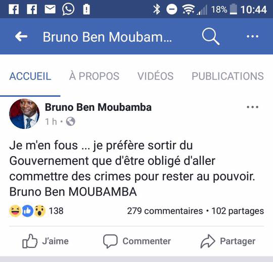 A peine viré hier soir du gouvernement Issoze Ngondet, Bruno Ben Moubamba commence à parler. Celui qui ne manquait de qualificatifs glorieux pour désigner son ancien ennemi Ali Bongo, a affirmé tard ce matin sur Facebook, qu’il aurait quitté le gouvernement parce qu’il se serait refusé à avoir recours à des "crimes" rituels pour demeurer au "pouvoir".